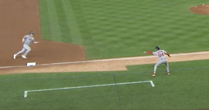 - Oltre a Duran (già citato), mi riferisco all’orribile tentativo di bunt di Raffaela e alla dilettantistica corsa sulle basi di Eaton. L’episodio più grave è il primo: Raffaela è il ns esterno centro del futuro, legato da un contratto pluriennale, non dovrebbe essere possibile che possa fare un pasticcio del genere; viceversa Eaton è un onesto mestierante, catapultato in un palcoscenico che, se non fossero occorse circostanze straordinarie, non avrebbe mai dovuto calcare. Questo episodio però è quello più irritante, perché certifica la fine delle nostre speranze di vincere la partita e perchè c’è un concorso di colpa di Hudson (il suggeritore di terza). Quando Chisholm riesce a bloccare in tuffo la radente di Yoshida, Eaton corre in prossimità del cuscino di terza e guarda correttamente il suggeritore, perché l’azione è alle sue spalle. Hudson gli indica chiaramente di fermarsi (se interpreto correttamente quello che si vede nella foto), ma con due out fermarsi non ha alcun senso. La difesa non ha alternativa ad assistere sulla base forzata e Eaton, un giocatore velocissimo, avrebbe segnato senza sforzo, facendo scoppiare il cervello a Bloome e a tutti i pigiami. Abbiamo corso il serio pericolo di vincere la partita, giustificando l’all in messo sul tavolo da Cora.